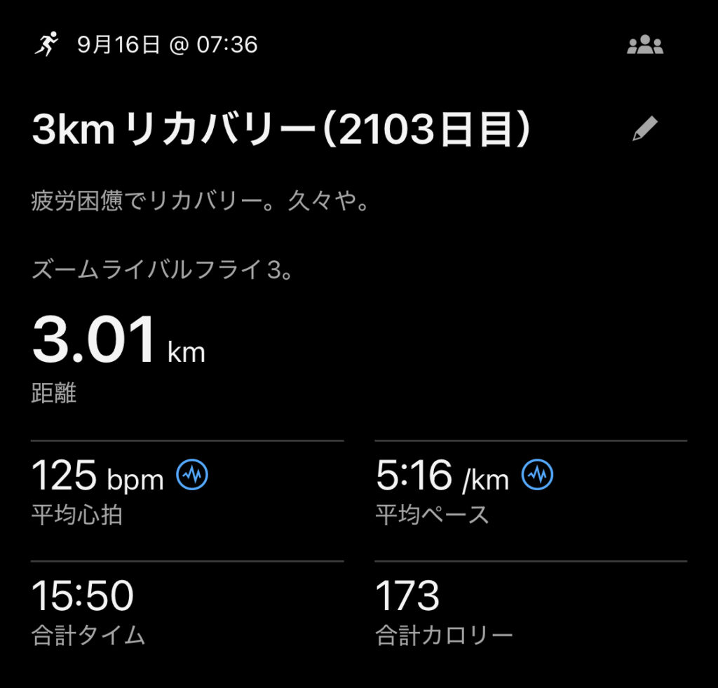 ・3kmリカバリー(ave5’16″/km)。