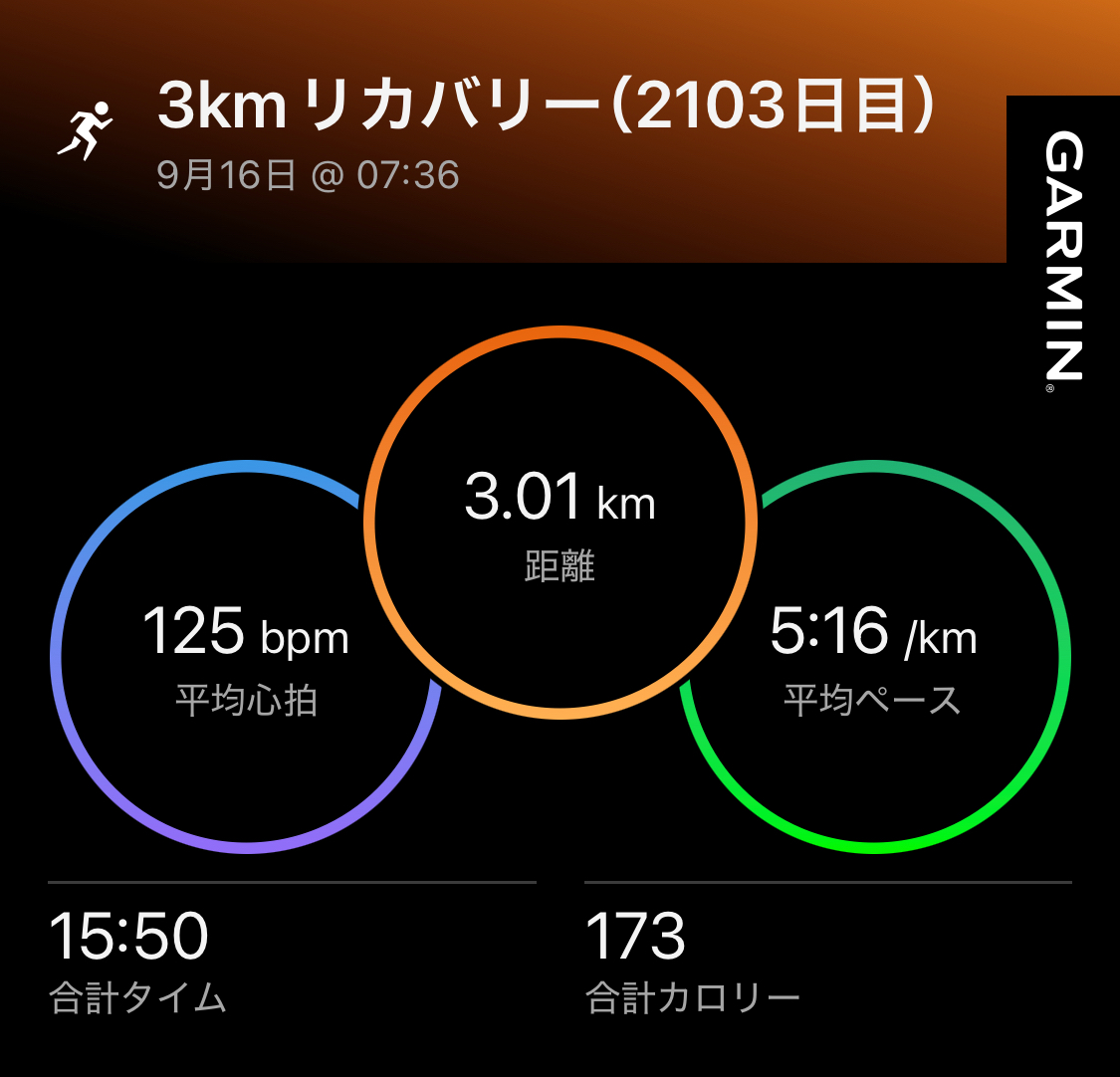 ・3kmリカバリー(ave5’16″/km)。