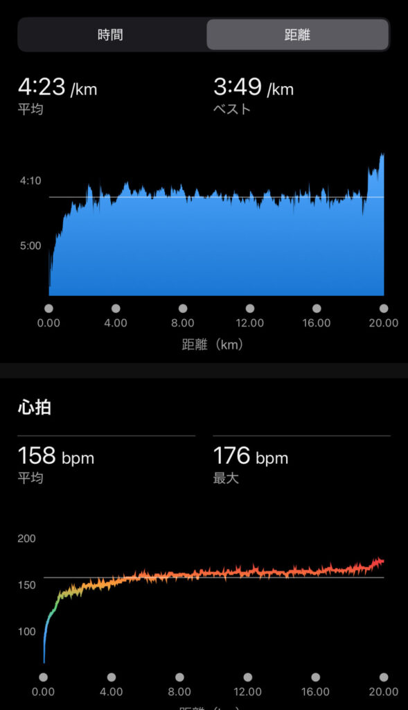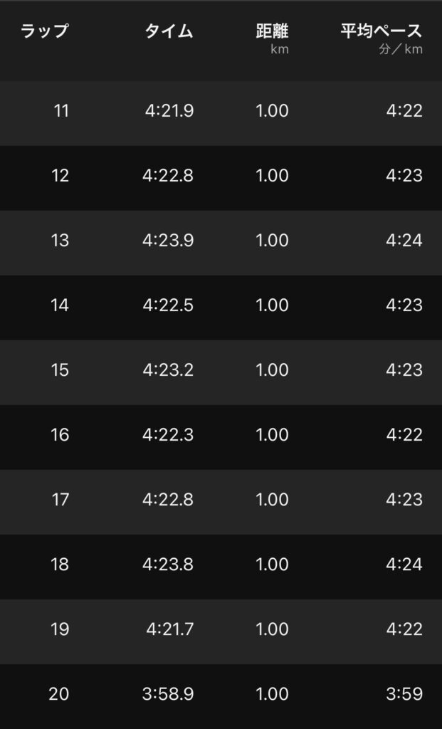 7km地点で結構しんどかったが、そこからペースアップは欲張らず辛抱の走り。