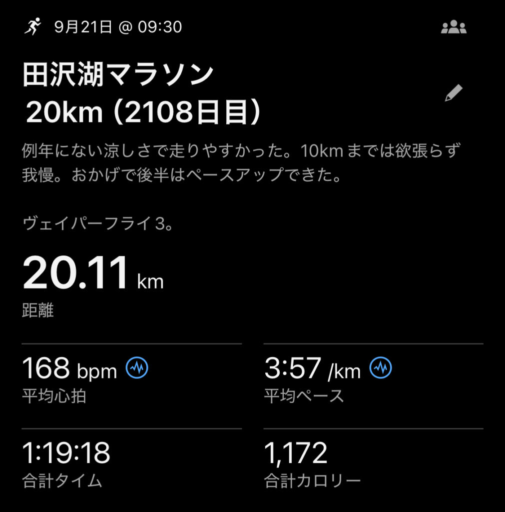・田沢湖マラソン20.11km:1:19’20″(ave3’57″/km)。