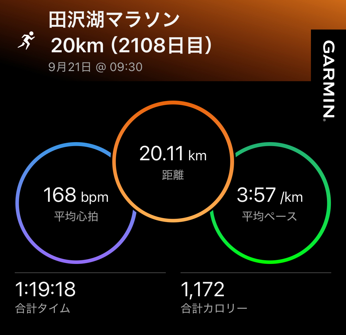 ・田沢湖マラソン20.11km:1:19’20″(ave3’57″/km)。