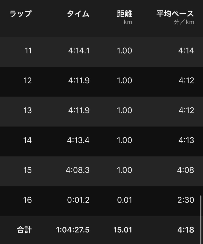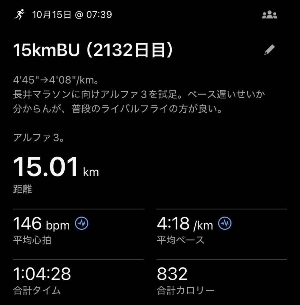 ・15kmBU(ave4’18″/km)。