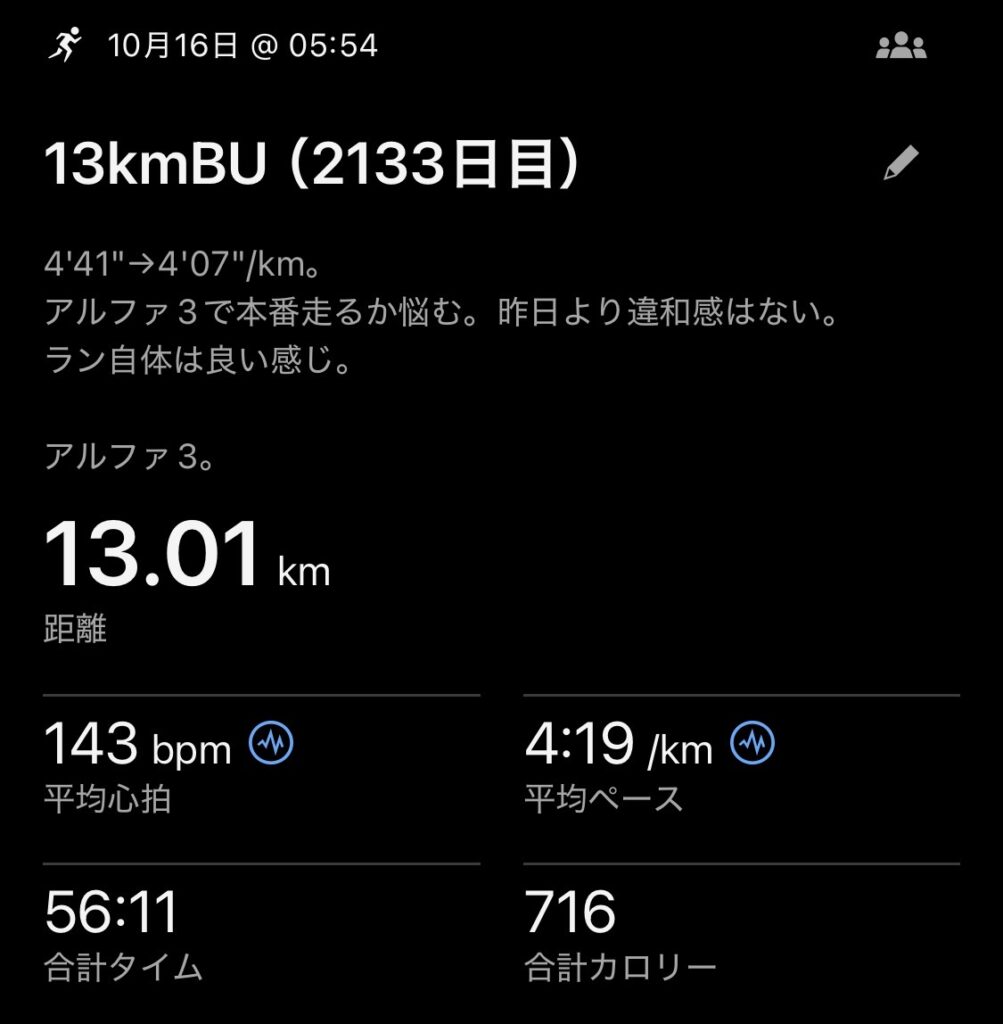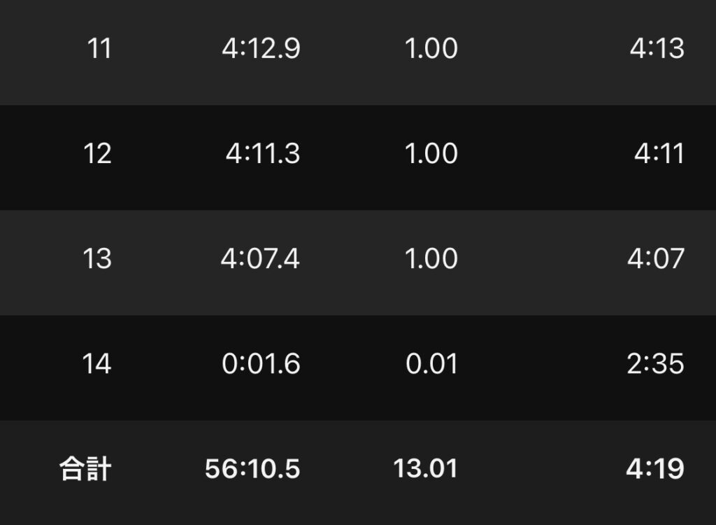 ・13kmBU(ave4’19″/km)。