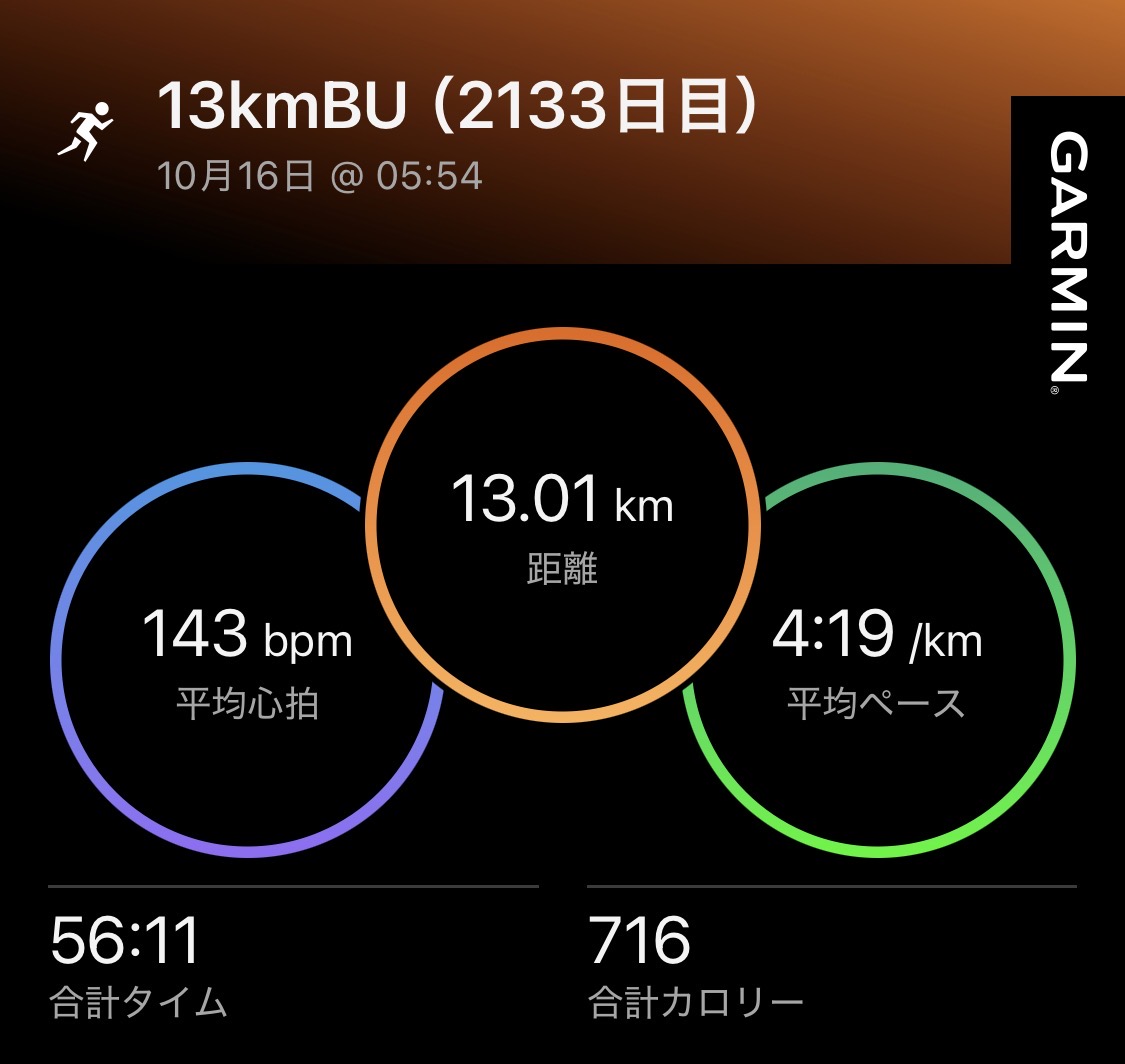 ・13kmBU(ave4’19″/km)。