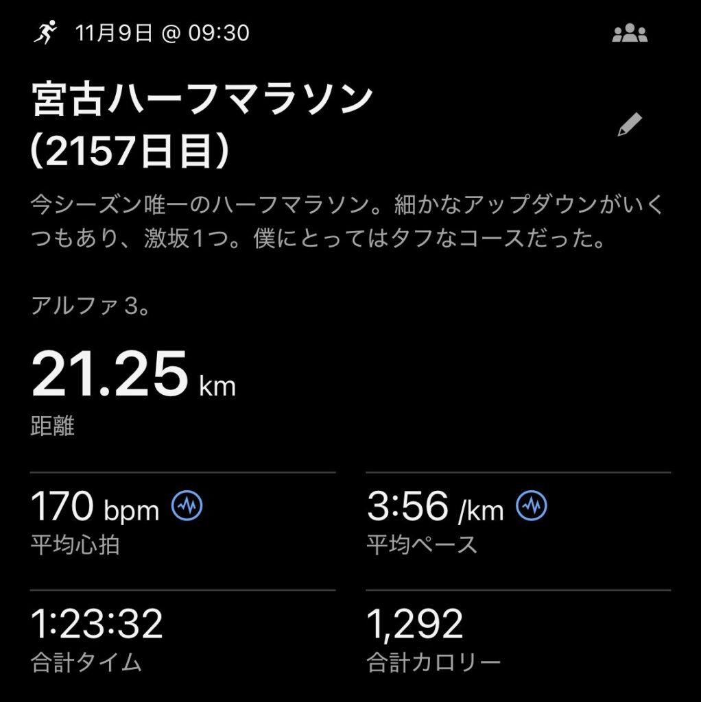 ・宮古サーモン・ハーフマラソン:1°23’32″(ave3’56″/km)。
