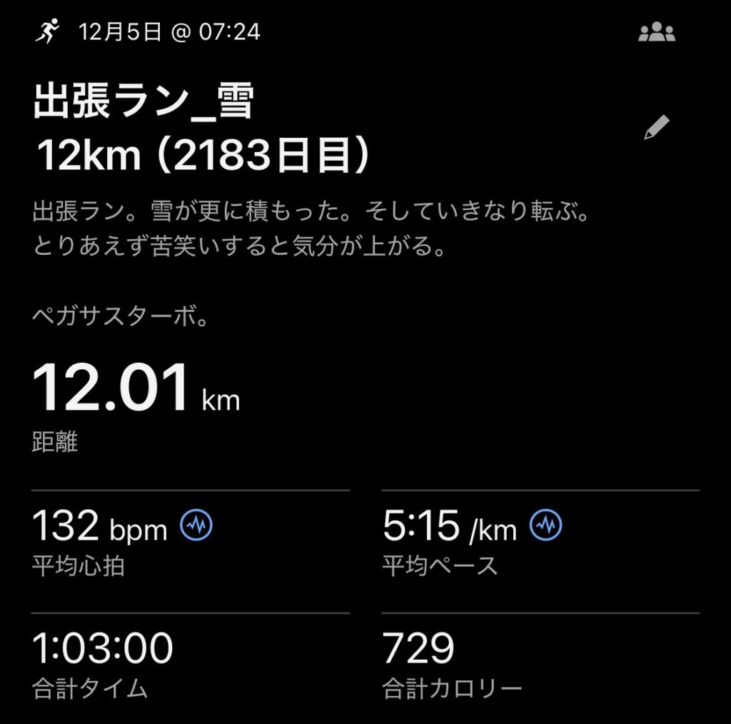 ・雪12kmジョグ(ave5’15″/km)。