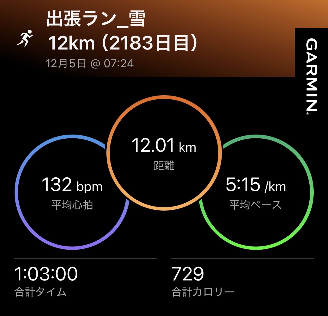 ・雪12kmジョグ(ave5’15″/km)。