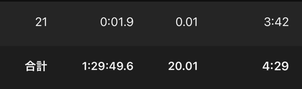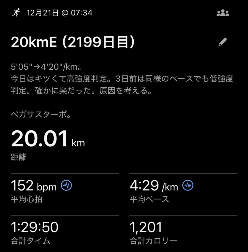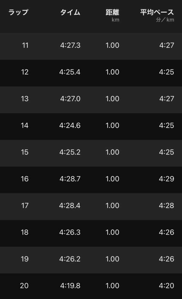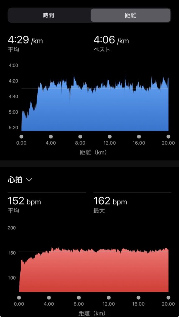 ・20kmE(ave4’29″/km)。