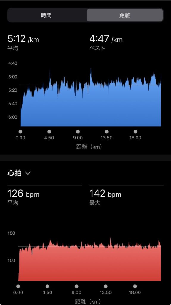 ・20kmジョグ(ave5’12″/km)。