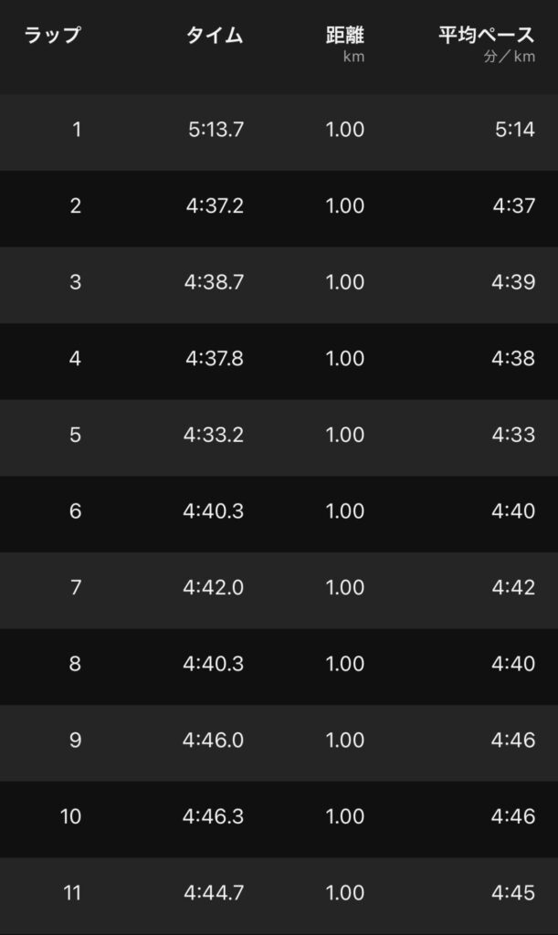 ave4’30″/km近くにもっていきたかった。