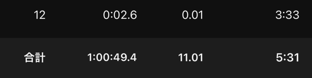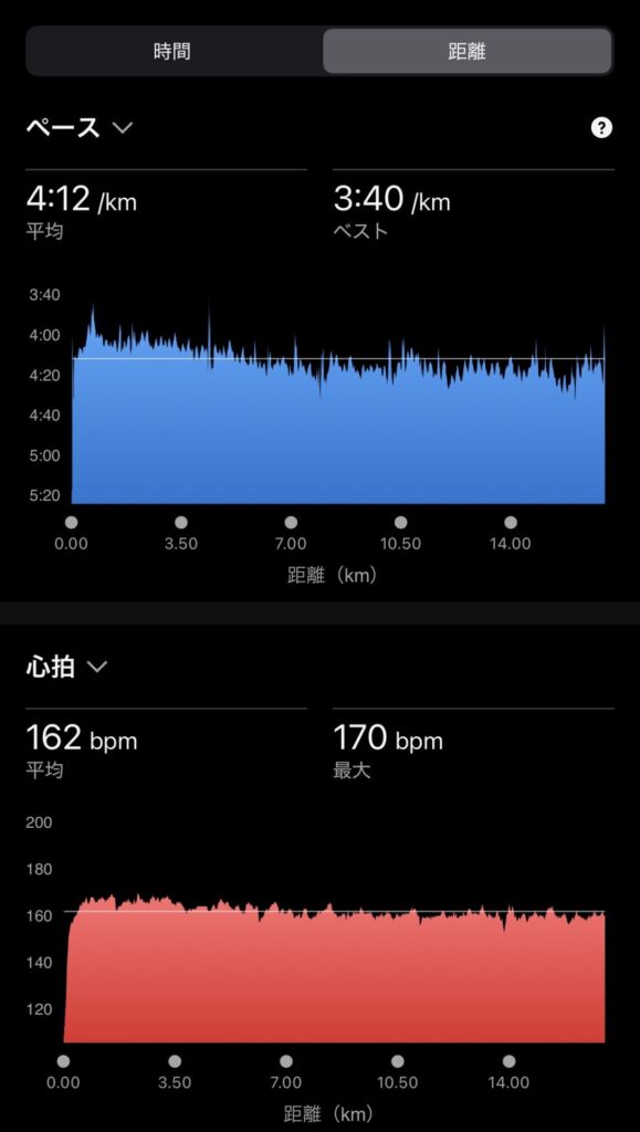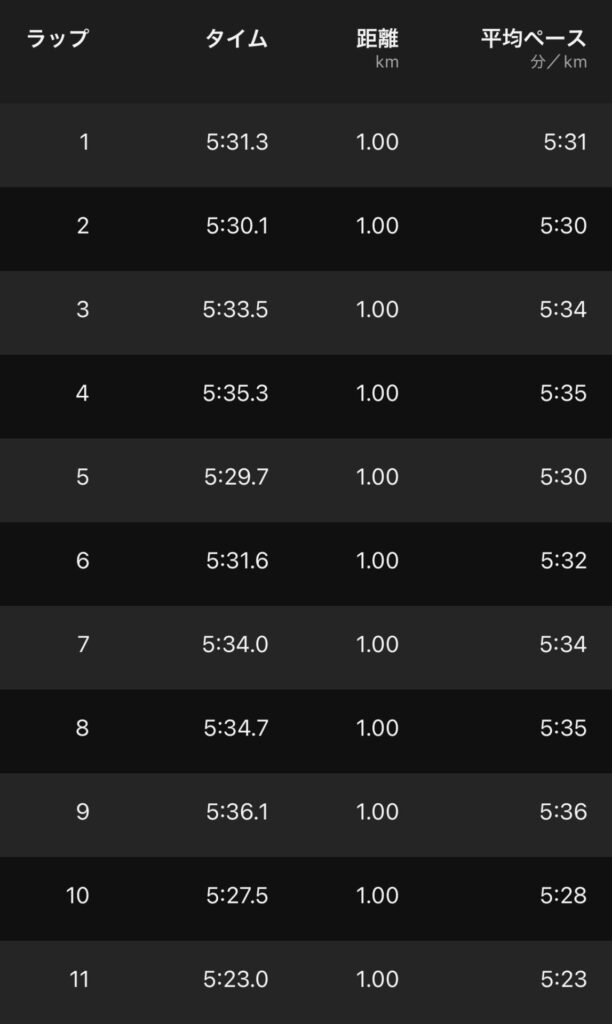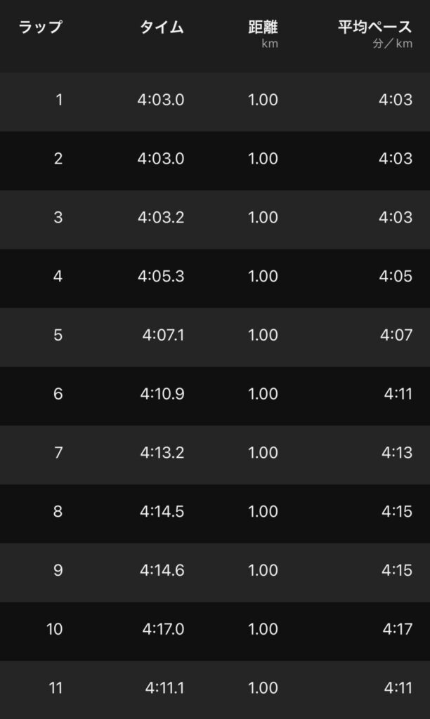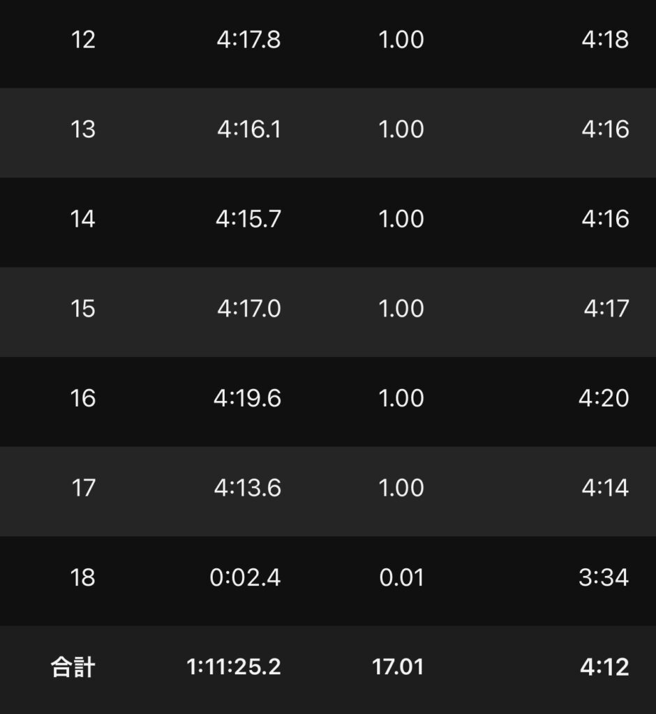 後半ペースが落ちて4’10″/km台。