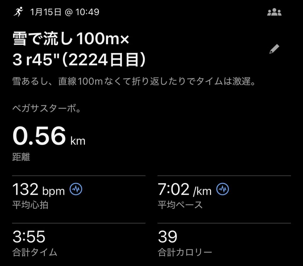 ・雪で流し100m×3(24.3-20.7-22.6s)。