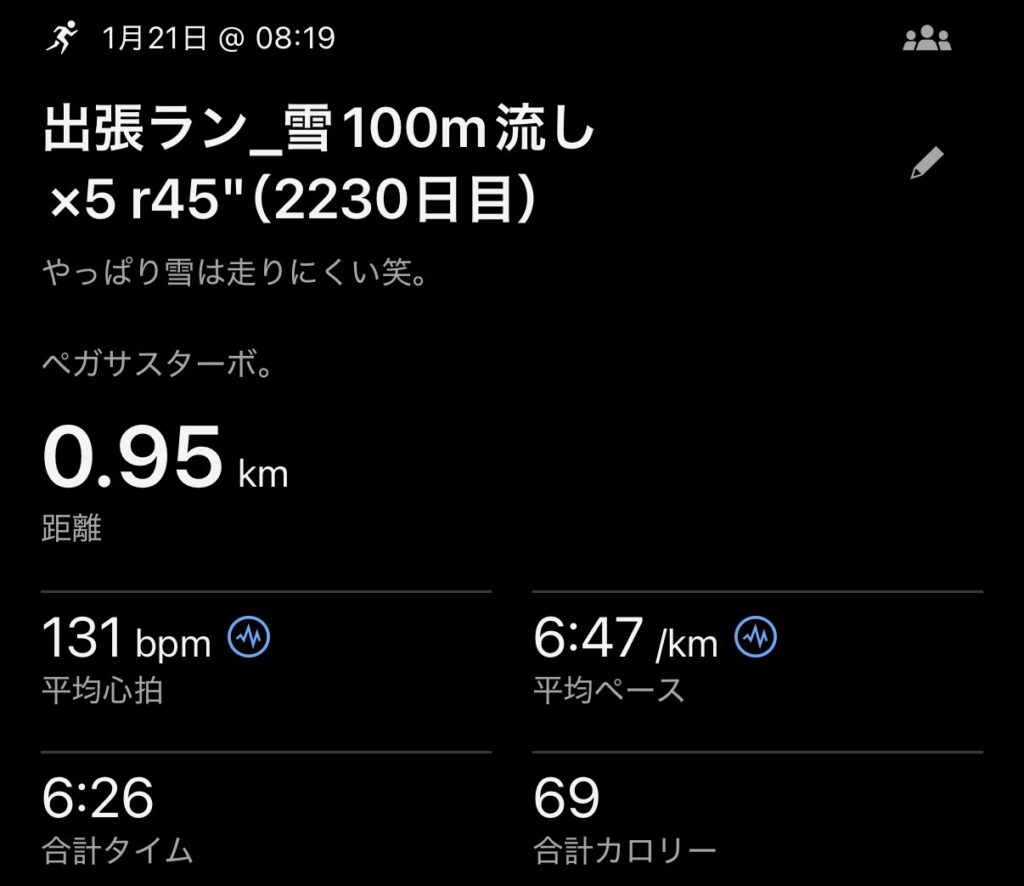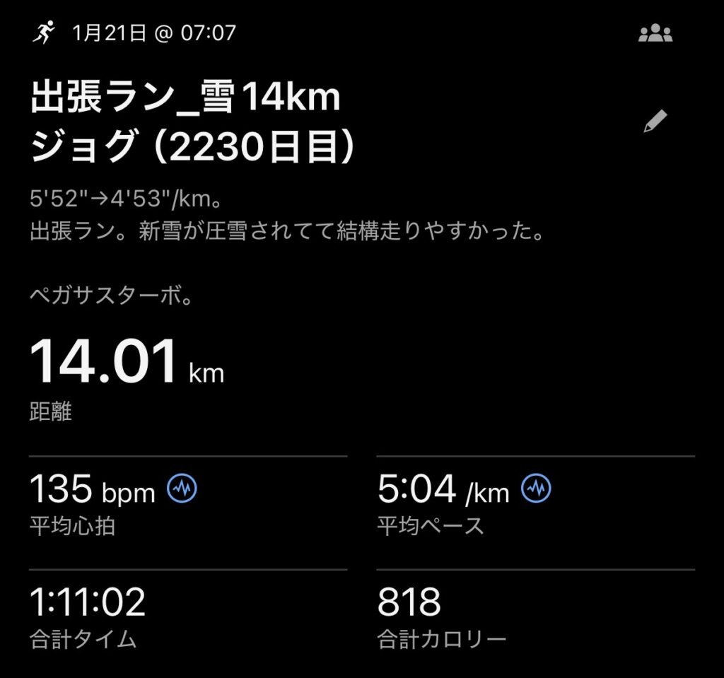 2026.1.21 出張ラン_雪14kmジョグ + 100m流し(2230日目)