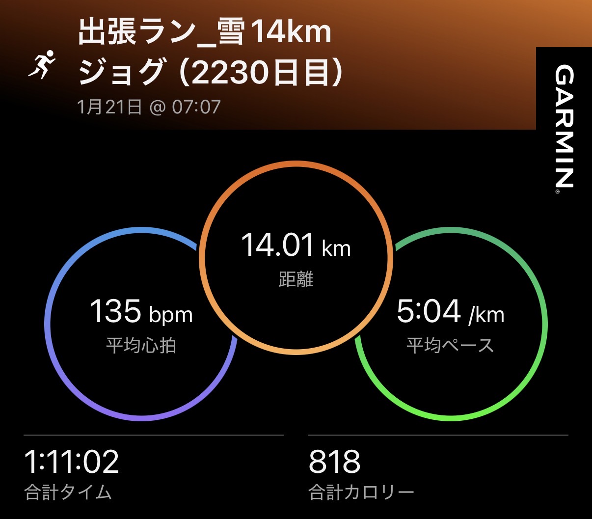 2026.1.21 出張ラン_雪14kmジョグ + 100m流し(2230日目)