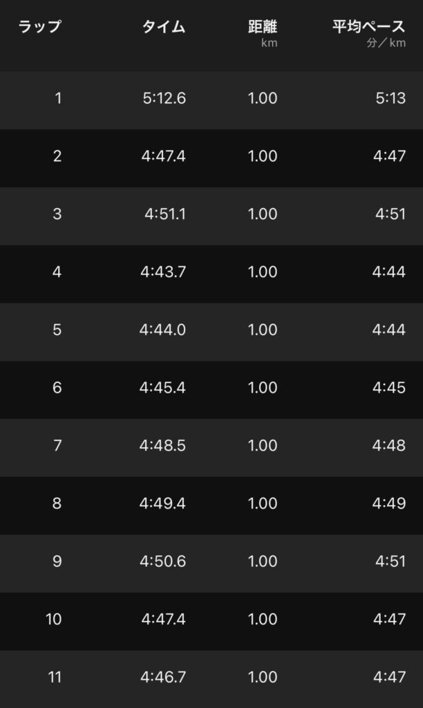 そこでスイッチが入り、4’20″/kmにペースアップ。