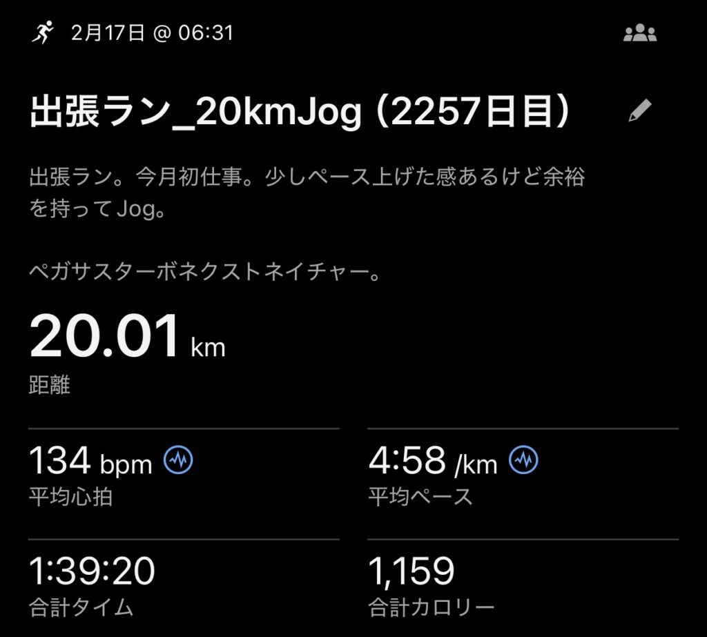 2026.02.17 出張ラン_20kmJog + 100m×6(2257日目)