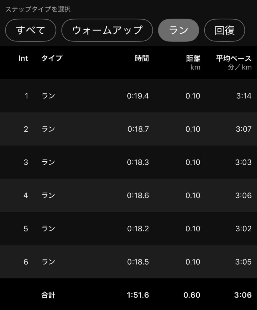 ・100m×6(19.4-18.7-18.3-18.6-18.2-18.5s)。