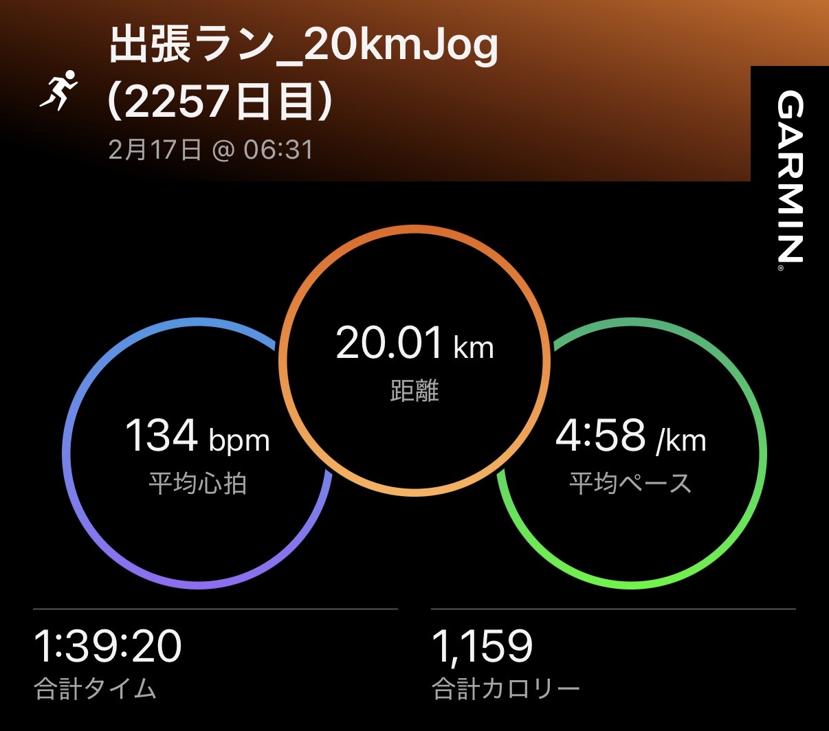 2026.02.17 出張ラン_20kmJog + 100m×6(2257日目)