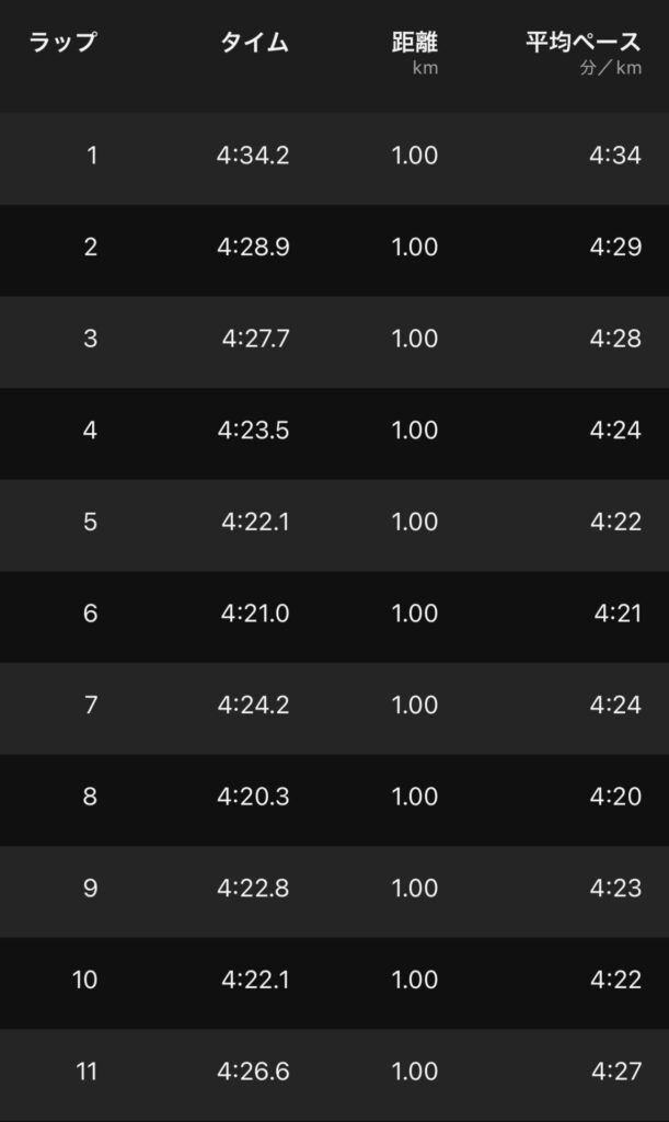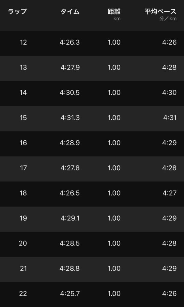 今日の予定は、22kmを4’30″/kmの中強度走。