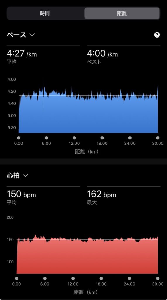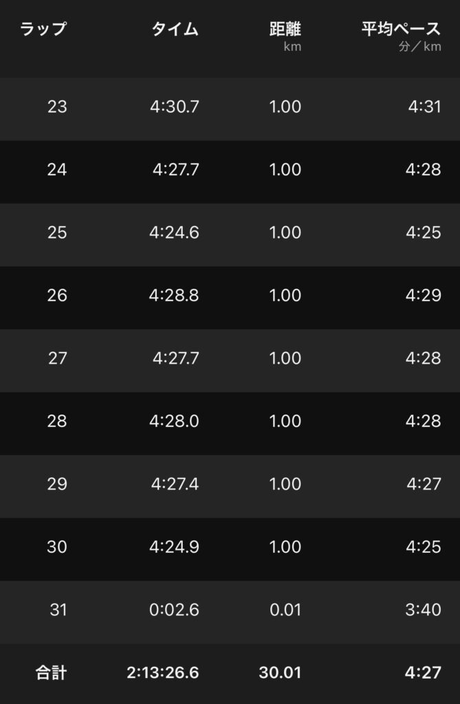 ・30kmE(ave4’27″/km)。