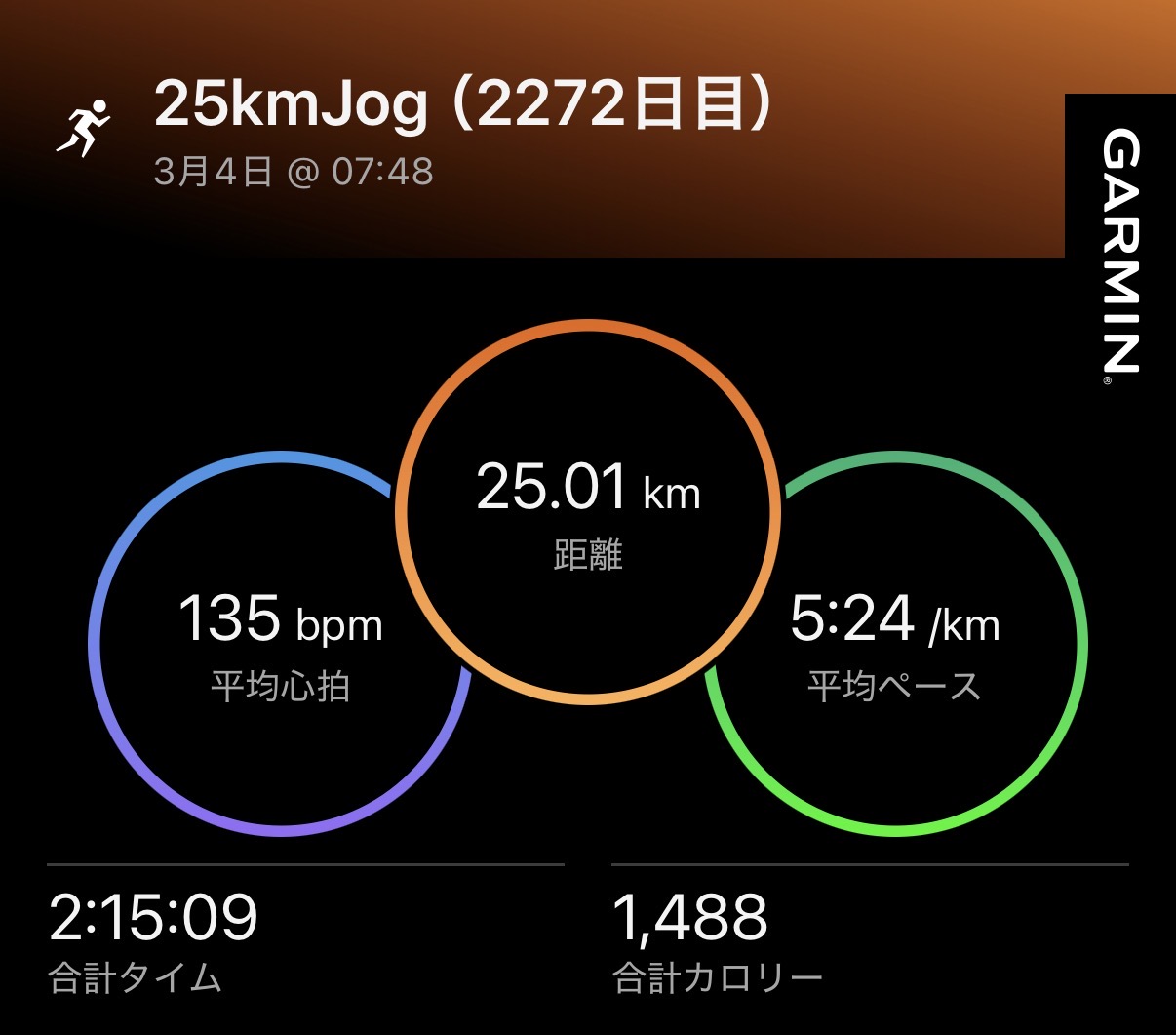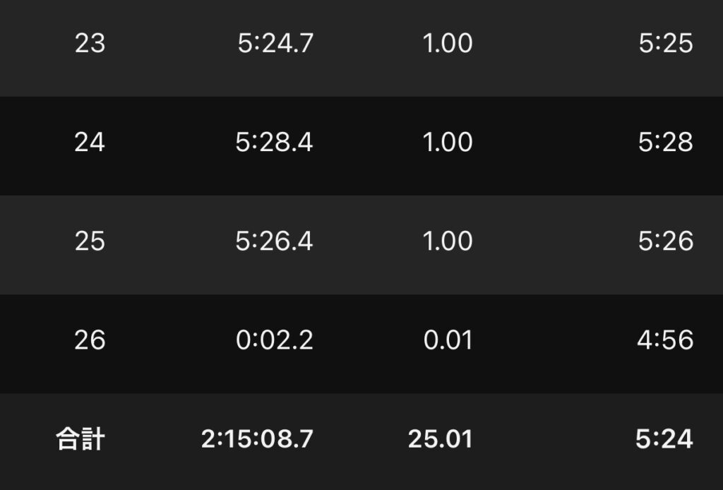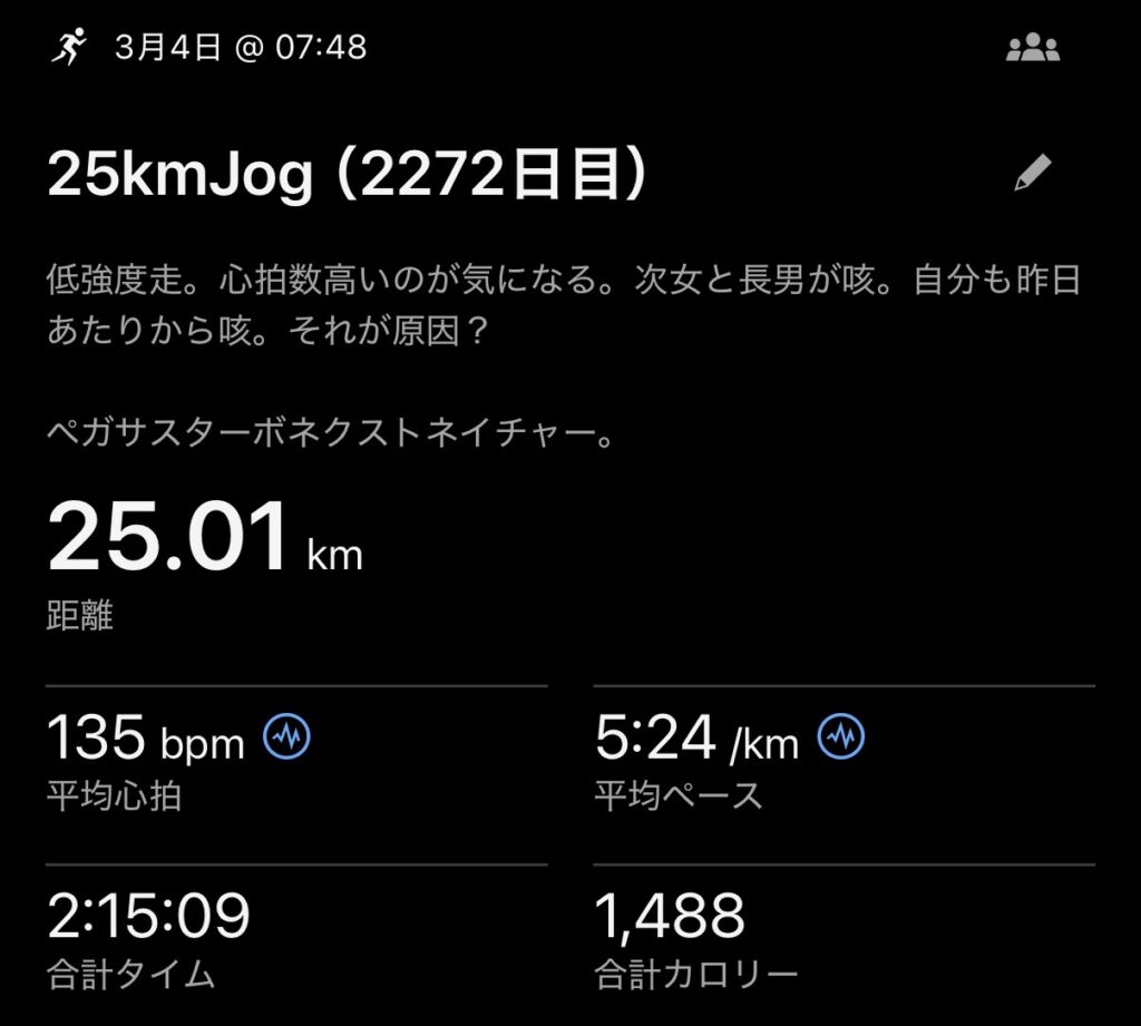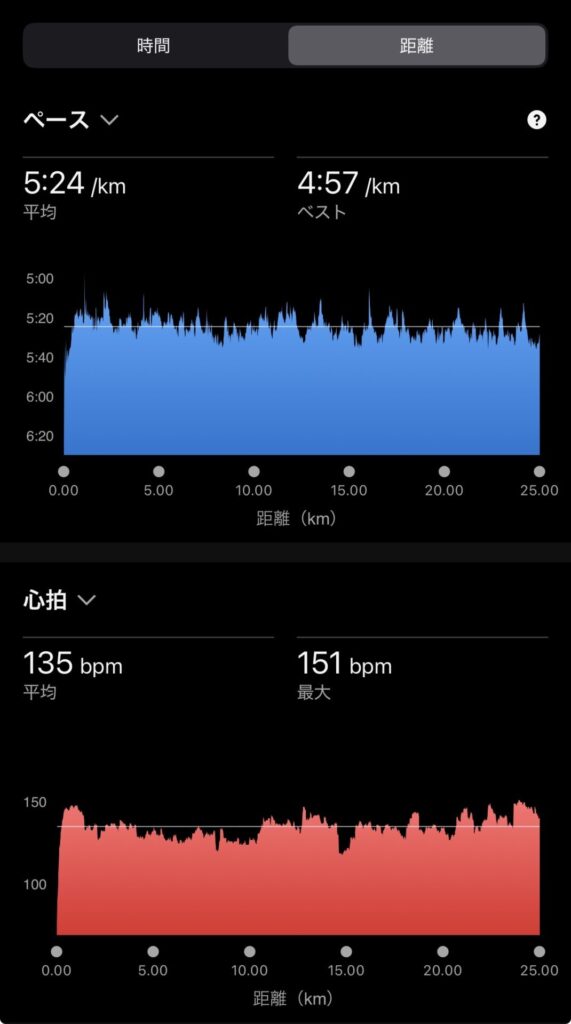・25kmJog(ave5’24″/km)。