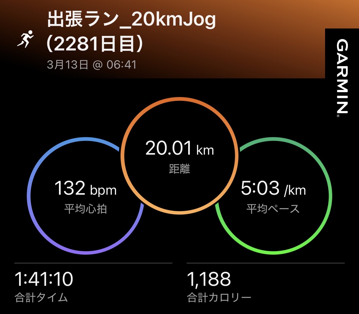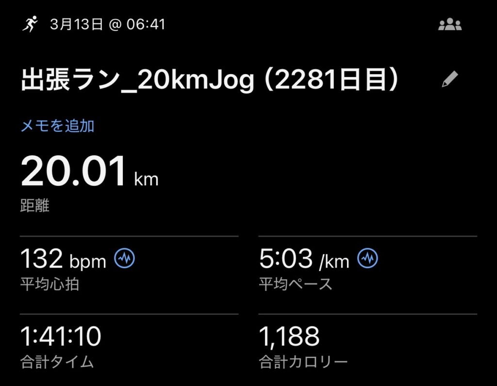 ・20kmJog(ave5’03″/km , ave132bpm)。