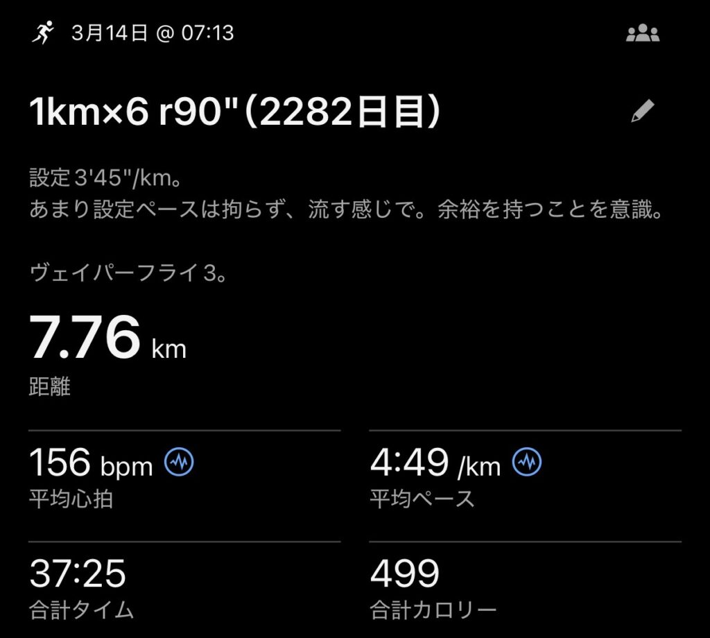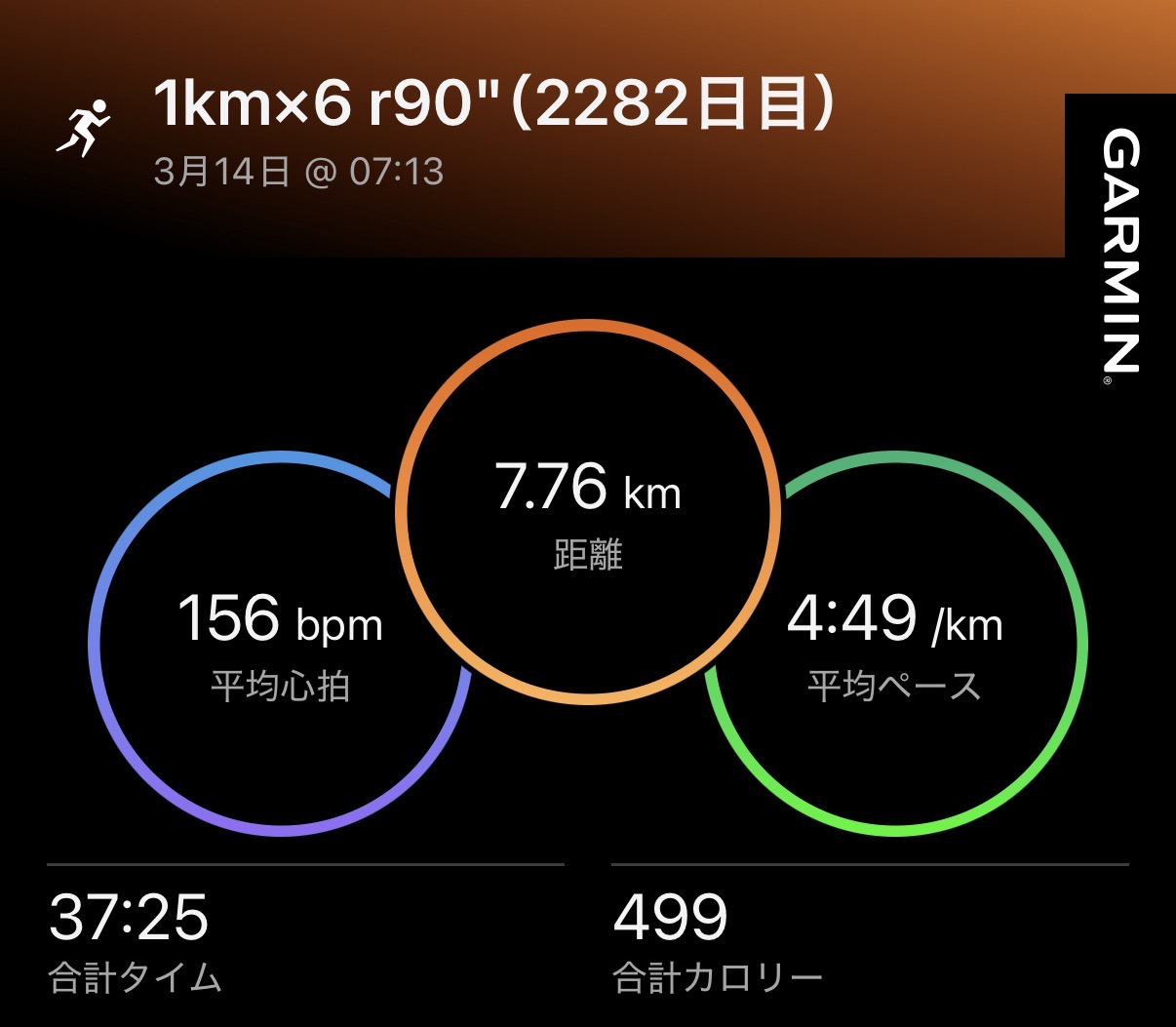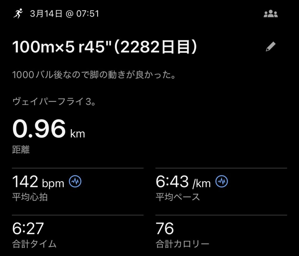 2026.03.14 1km×6 + 100m×5(2282日目)