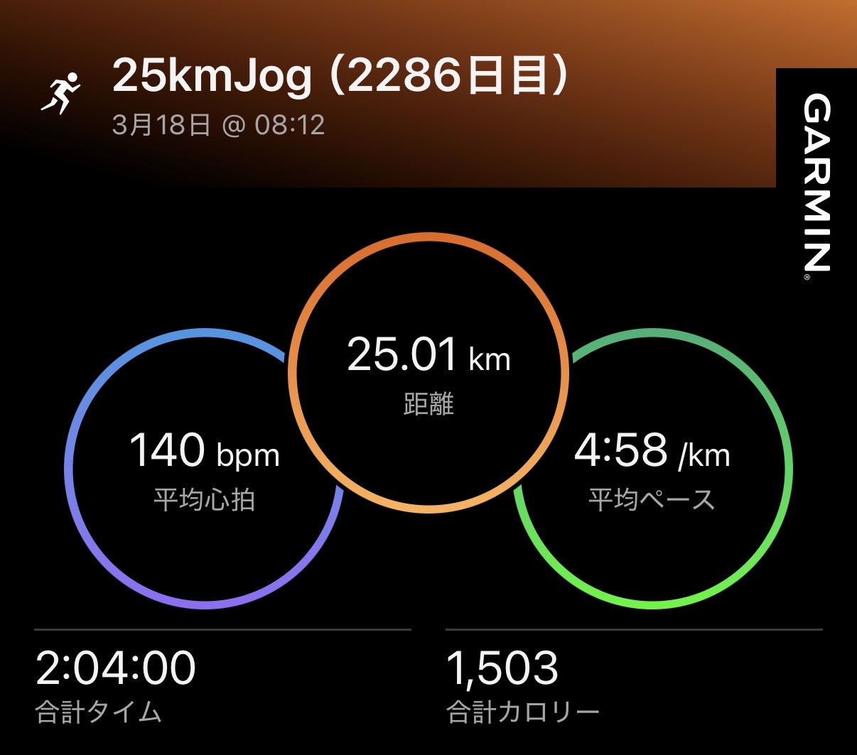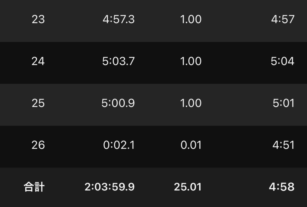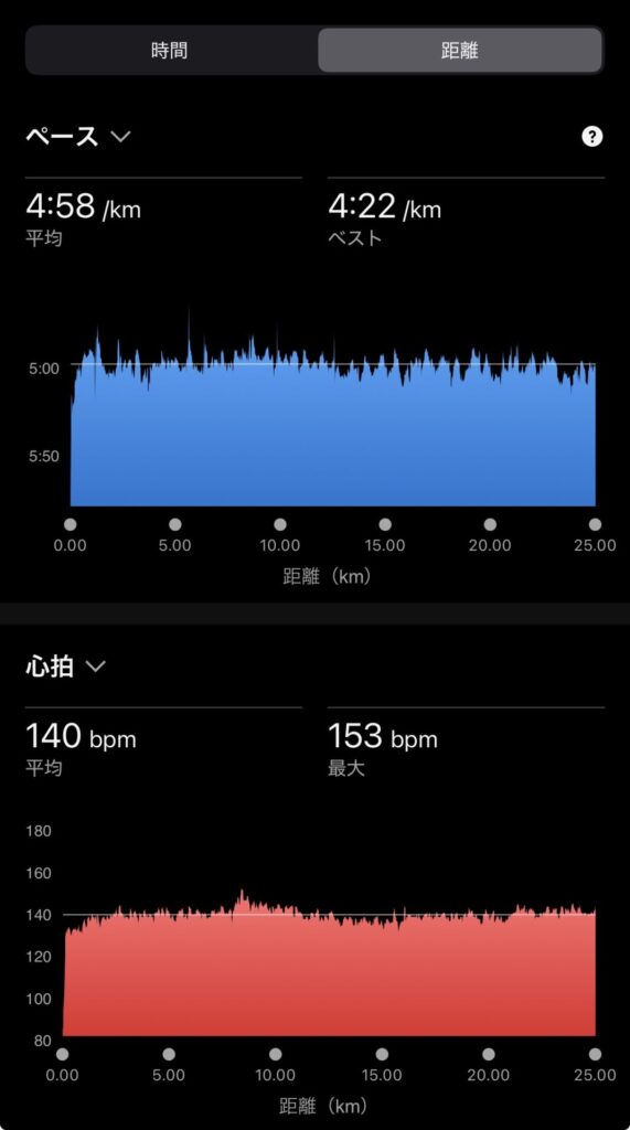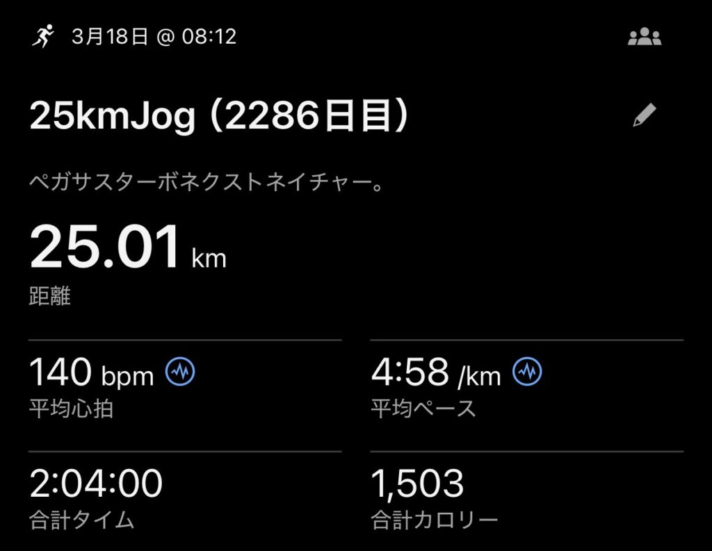 ・25kmJog(ave4’58″/km , ave140bpm)。