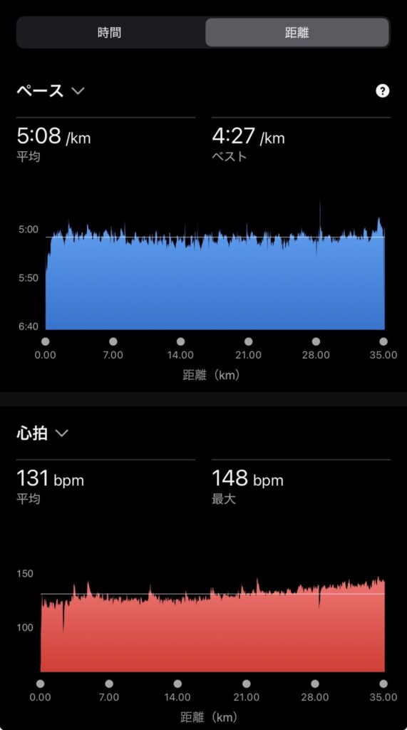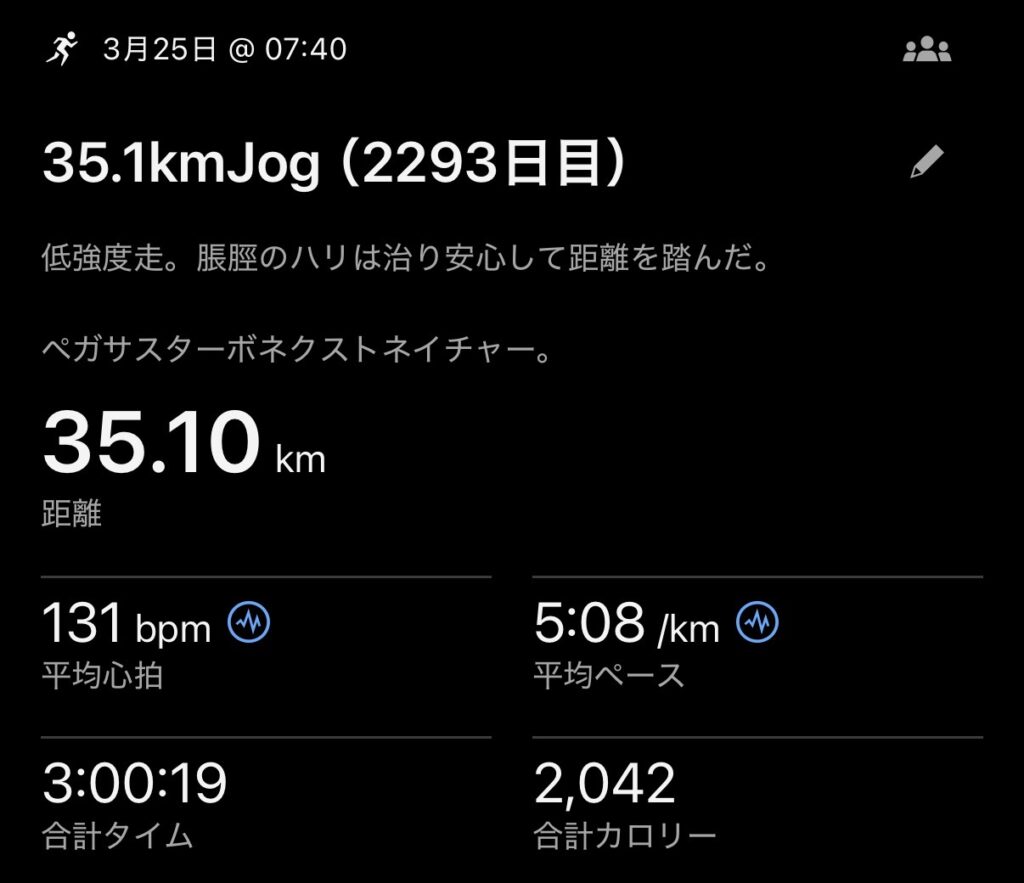 ・35.1kmJog(ave5’08″/km , ave131bpm)。