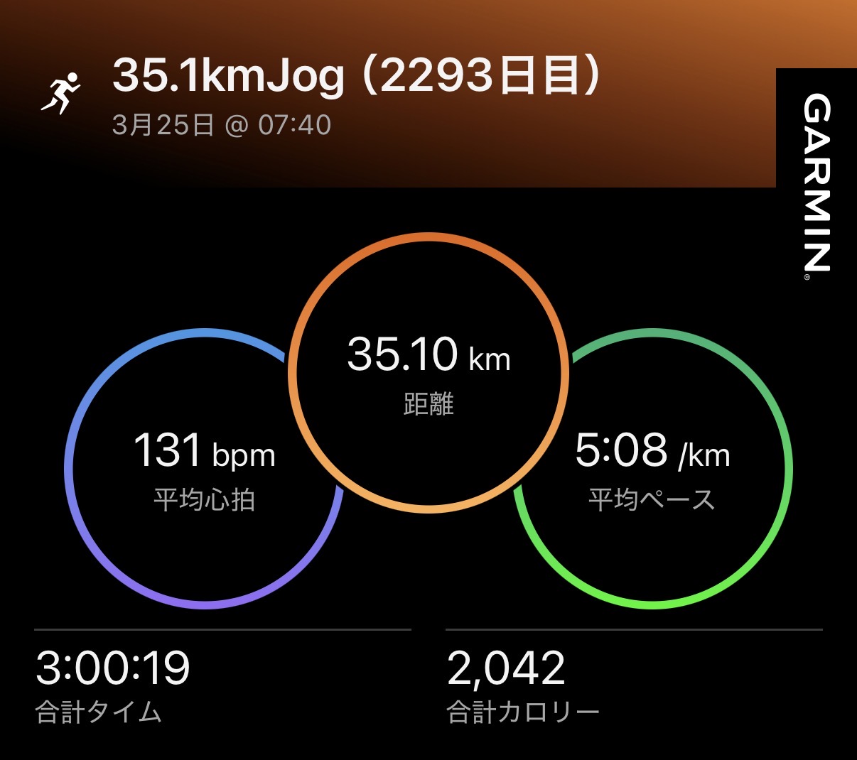 ・35.1kmJog(ave5’08″/km , ave131bpm)。