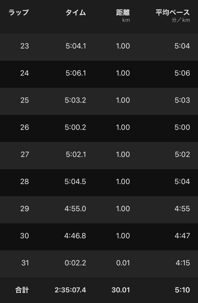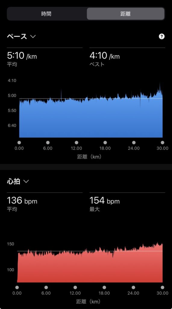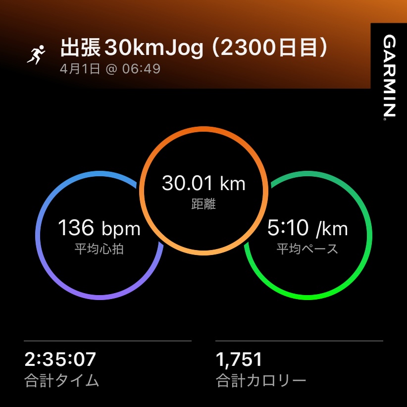 ・30kmJog(ave5’10″/km , ave136bpm)。