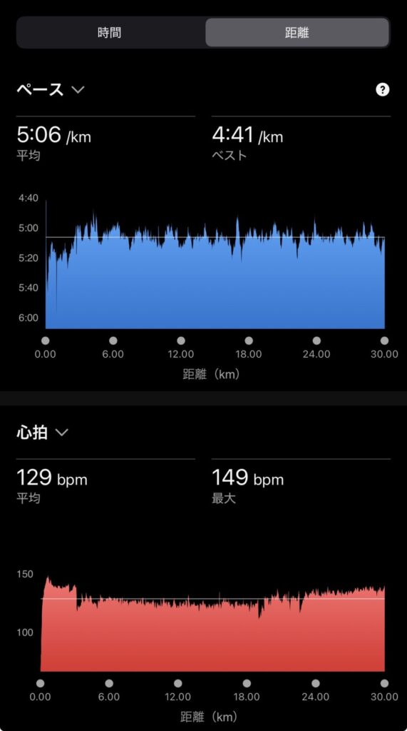 ・30kmJog(ave5’06″/km , ave129bpm)。