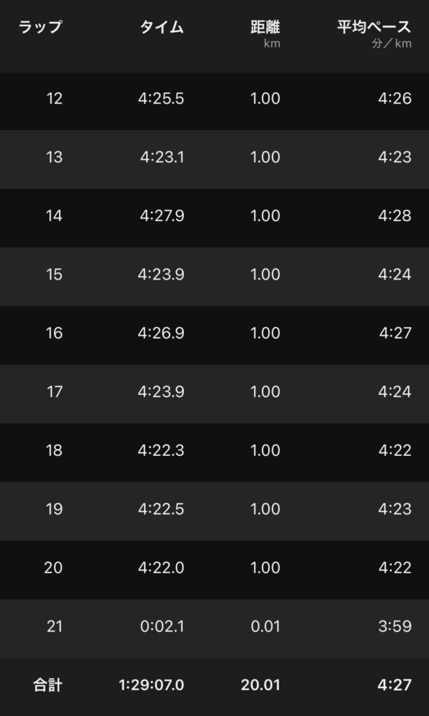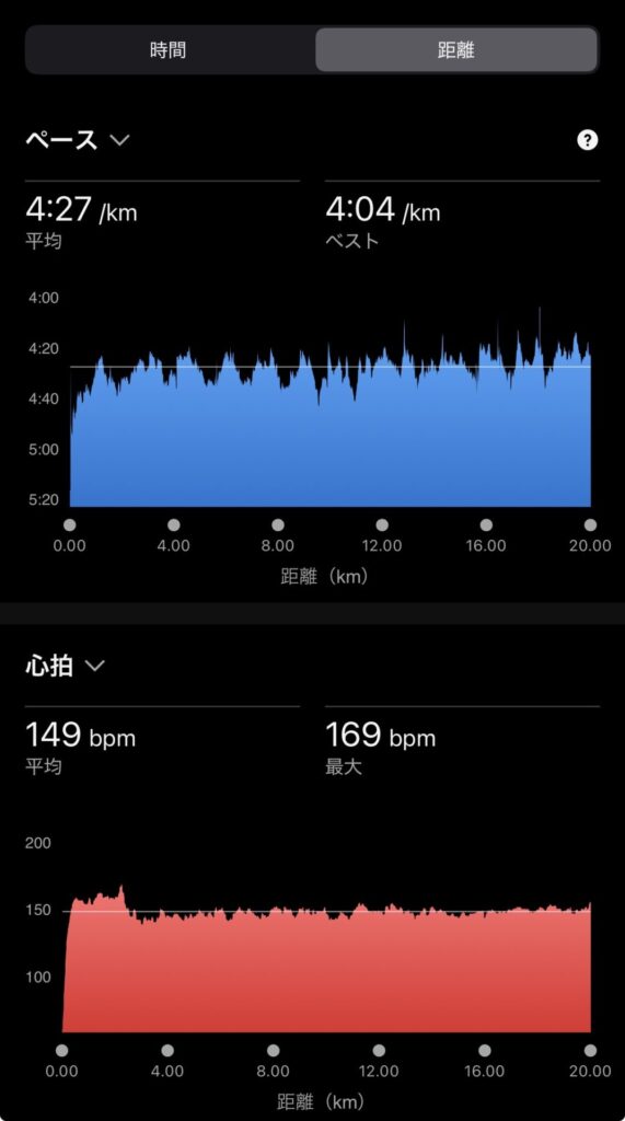 ・20kmE(ave4’27″/km , ave149bpm)。