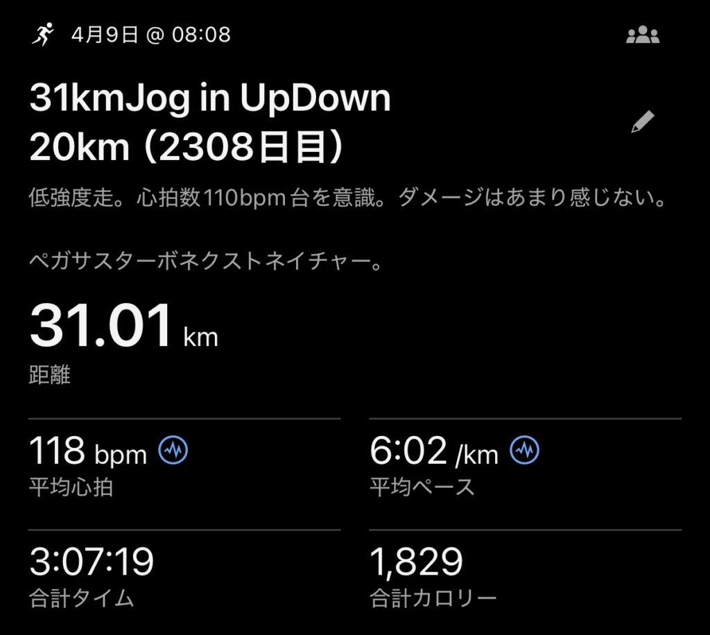 ・31kmLSD in UpDown20km(ave6’01″/km , ave118bpm)。