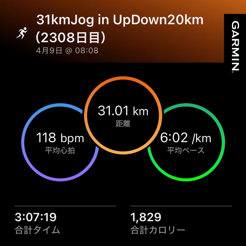 ・31kmLSD in UpDown20km(ave6’01″/km , ave118bpm)。