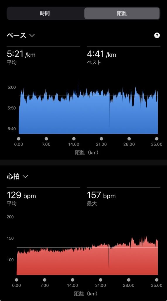 ・35.3kmJog(ave5’21″/km , ave129bpm)。