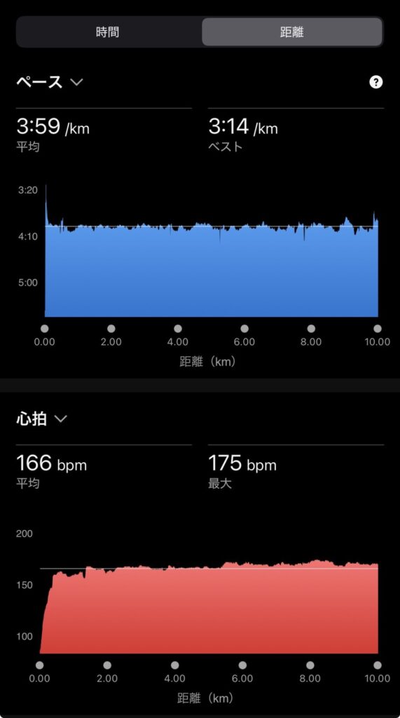 ・10kmM(ave3’59″/km , ave166bpm)。