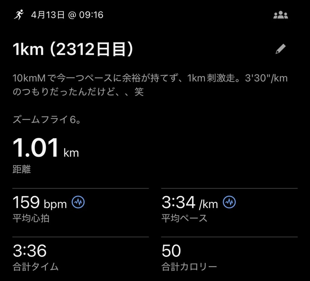 でも納得はできないので、気休めに1km刺激走をプラス。