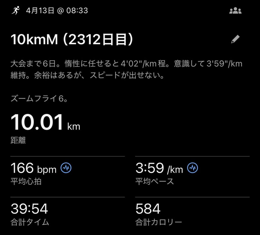 6日後の大会に向けてマラソンペースで10km。