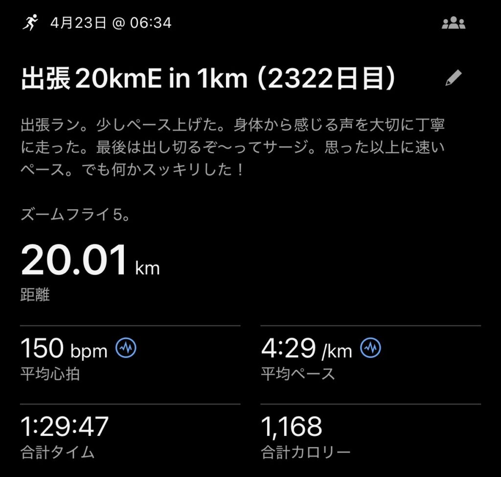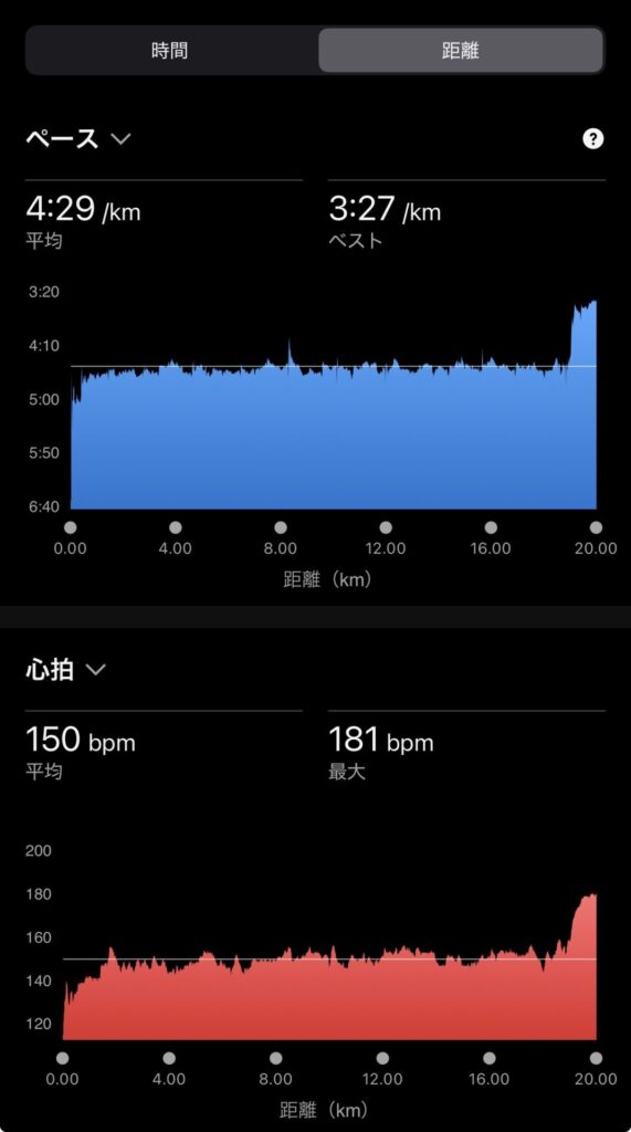 ・20kmE in 1km(ave4’29″/km in 3’36″/km , ave150bpm)。