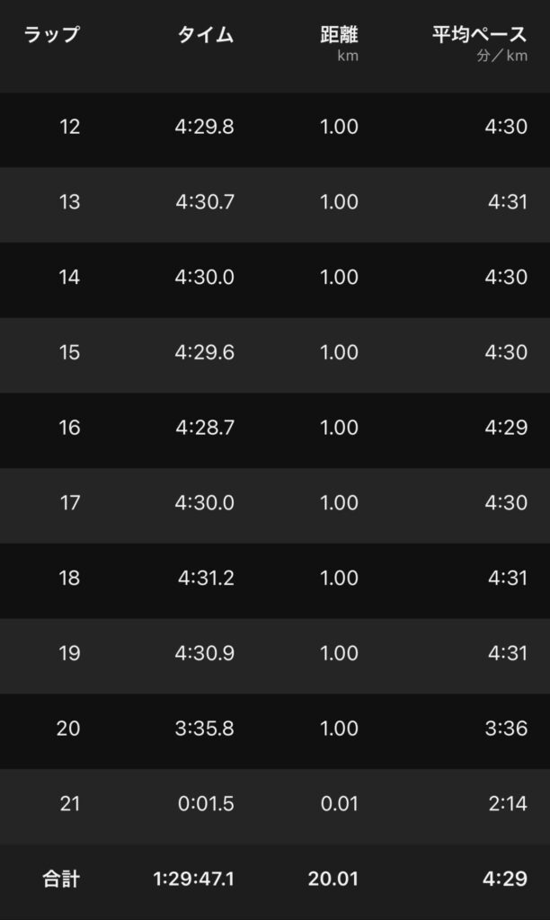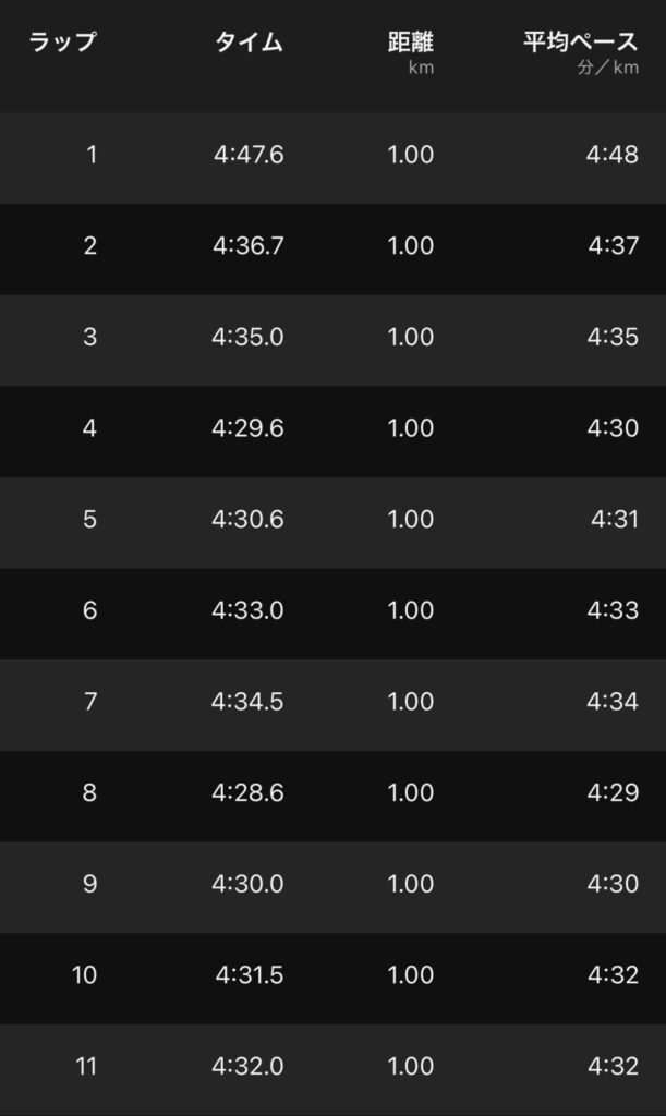 ペースの割にキツさがなく、3’30″/kmを狙ったけど、届かず。