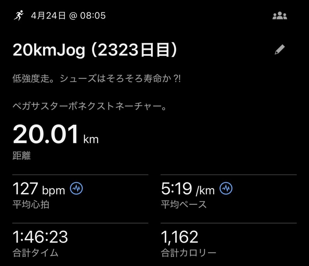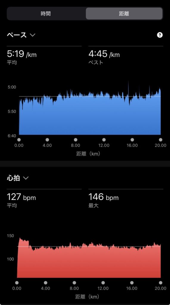 ・20kmJog(ave5’19″/km , ave127bpm)。