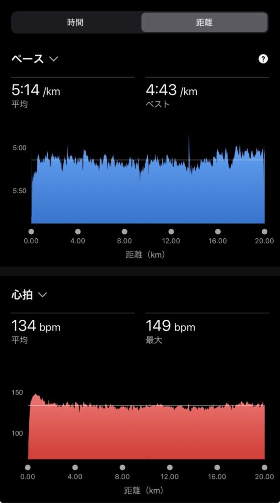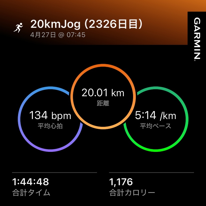 ・20kmJog(ave5’10″/km , ave130bpm)。